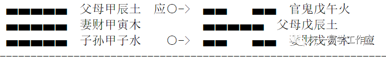 上三爻坎卦,即是坎在外卦,申金、戌土、子水,所以四爻申金、五爻戌土、六爻子水。变为乾卦,即是乾在外卦,午火、申金、戌土,所以申金变出午火,子水变出戌土,申爻不动,则不变。变出之爻,按六亲者,仍照正卦而推,余卦仿此。