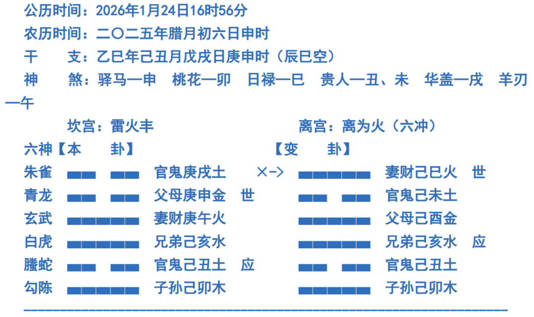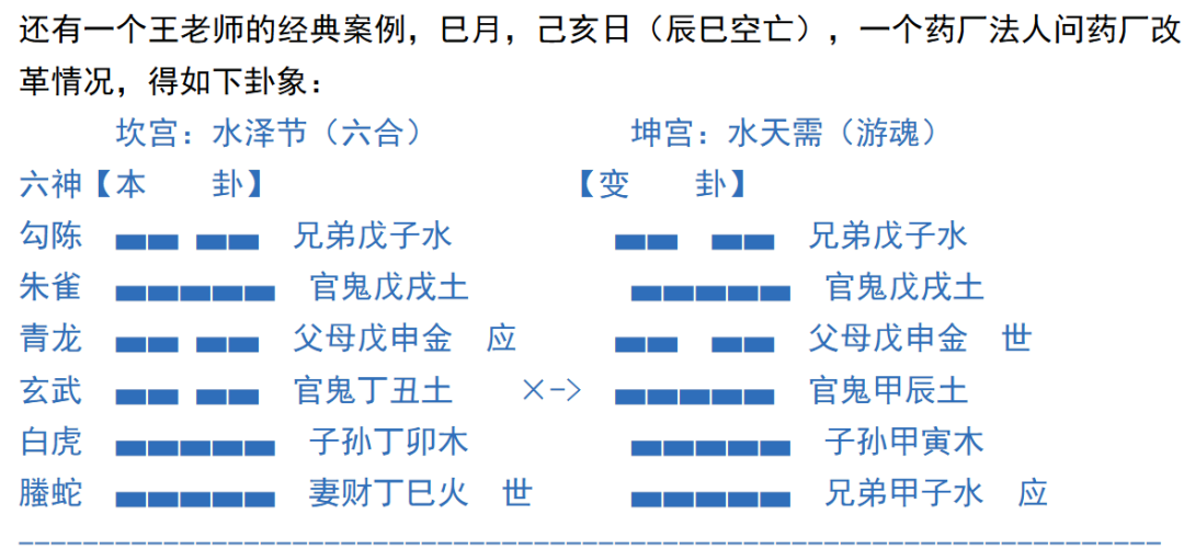 而爻象层面,王老师解释,牵扯到六爻子水(静爻)克世,非拉扯出来一个勾陈克世为牢狱,有说服力吗?说巳火空亡,财力不够,还勉强说的过去,但是巳临月令,也最多说财运紧巴点而已。
