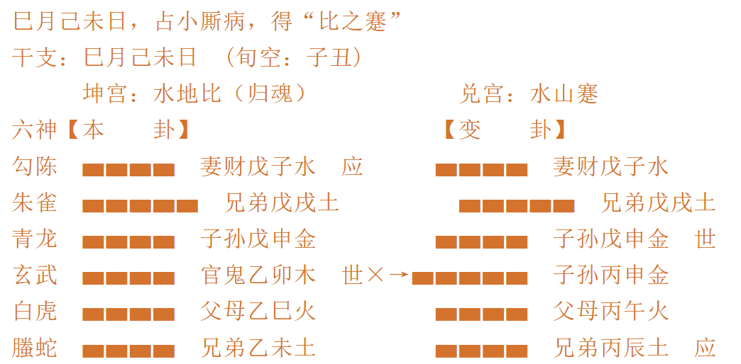 坤代表仆人,仆人有温顺,听话,有顺从之德,所以坤为劳役,这个取象是很形象很精准的,这就是卦象的太极点,上面坎为病,直读为仆人生病,但是坎为忧为病,巳月未日很弱,根本不成忧虑,所以小厮病无妨,但是爻象层面,却反应出来自己官职堪忧的大事,而从爻象层面如果非断小厮病吉凶,野鹤老人也只能用“财为用神,近病逢空则愈”的断语了,但是实际上这个断语是问题的,根本不是绝对的,因为逢空,也有归天的意思,只能旺相逢空,才可能符合近病逢空则愈的短语。