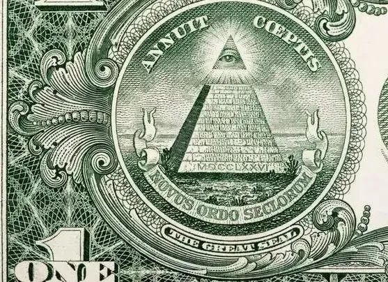 1933年,美联储成立20周年,光明会的标志“全知之眼”被印到了新发行的美元上并一直保留到今天,其下面的一行拉丁文 NOVUS ORDO SECLORUM 意为: