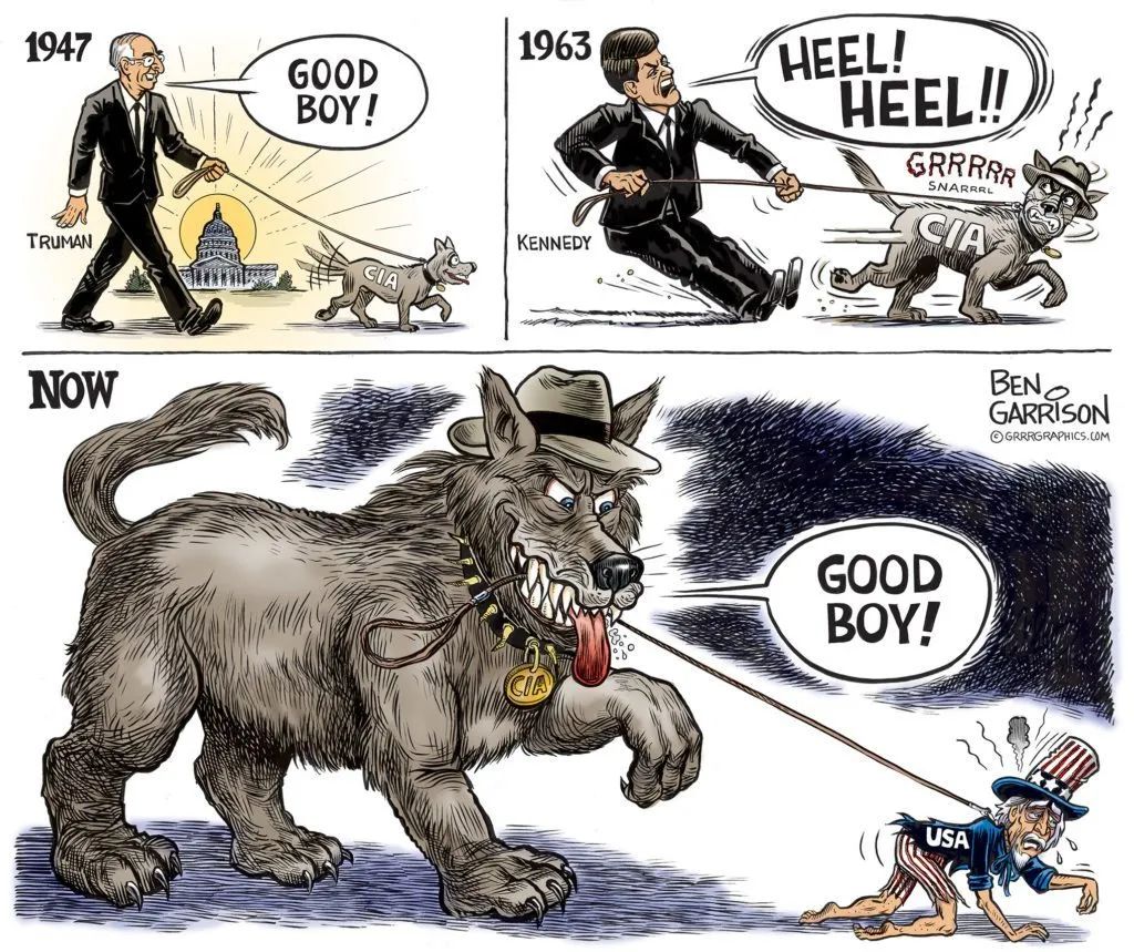 美国现今最大的恐怖组织,尾大不掉涉及全球毒品和人口贩卖的利益集团中情局就是洛克菲勒家族的杰作:中情局创始人艾伦·杜勒斯和洛克菲勒是堂兄弟。杜勒斯创建了中情局,协助转移了大批纳粹分子到南美洲,谋划了对肯尼迪的刺杀并与穆斯林兄弟会达成协议,利用惨绝人寰的心理学实验创造了一群受到精神控制的刺客。有关冷战期间中情局给全球涉贩毒业务的反政府武装提供军火以抵抗亚非拉的赤化,致使中情局与毒资售武业务牵连成为全球最大毒贩在前文有提过,此处不赘述。其实在更早前约翰·福斯特·杜勒斯 (John Foster Dulles) 兄弟在1929年股市崩盘期间内控制了虚假的高盛信托基金,并帮助他的兄弟推翻了伊朗和危地马拉的政府。这两人都是骷髅会、美国外交关系委员会 (CFR) 和第33级共济会会员。