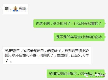 我告诉客户这是典型的业障病,病情应该起于2009年,当年有动土等事情,或者动祖坟等事情,不知道怎么沾惹邪气了,客户反馈:就是09年,我爸装修家里,装修好了,我老感觉很不舒服,很不自在和不安,时间长了,变成病,已经5,6年了……