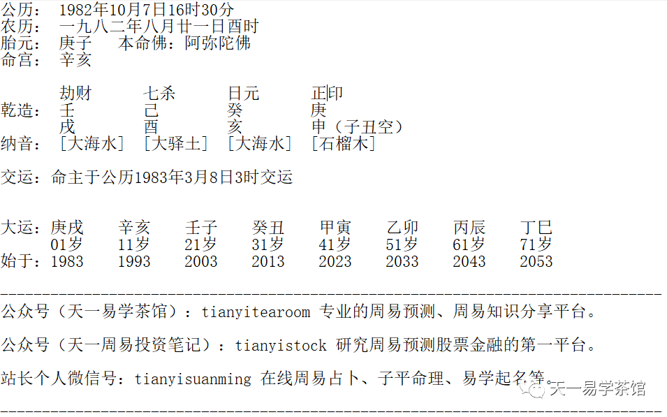 微信名:天一周易馆,微信号:tianyisuanming,天津人,大学毕业。自幼酷爱易学,精通周易占卜,深研子平术,涉猎风水、大六壬、梅花易数等多种术数,职业预测已十多年。佛易双修,反对封建迷信,传播易学正能量,古为今用,信奉格言:天行健,君子以自强不息,地势坤,君子以厚德载物。