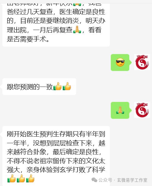 刚开始医生预判生存期只有半年到一年半,没想到层层检查下来,越来越符合卦象,最后确定是良性,不得不说老祖宗留传下来的文化太强大,亲身体验到玄学打败了科学。