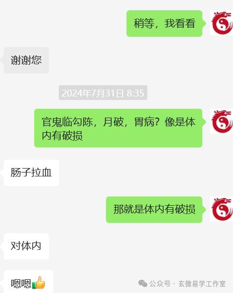 2,以六爻论,父母酉金为用神吗?《增删》派大抵如此,但显然不对,我现在怀疑京管郭用的方法,就是《易隐》中记录的方法,只是《易隐》案例不多,是一大缺点,按照《易隐》,以二爻官鬼丑土为用神,临勾陈,离为腹,我断腹内破损,丑土为肠道,多有见血之象;