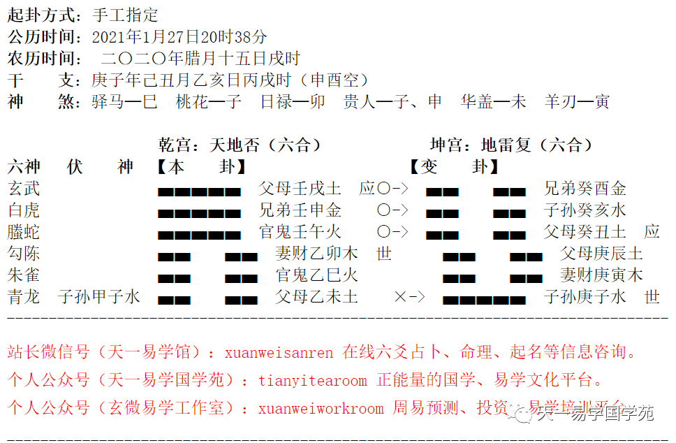 这是2020年冬天的一个卦象,很有意义,是为数不多的拆迁卦,当时客户说:想预测一下家里的房拆迁能不能成功,什么时候能拆,起卦如下——