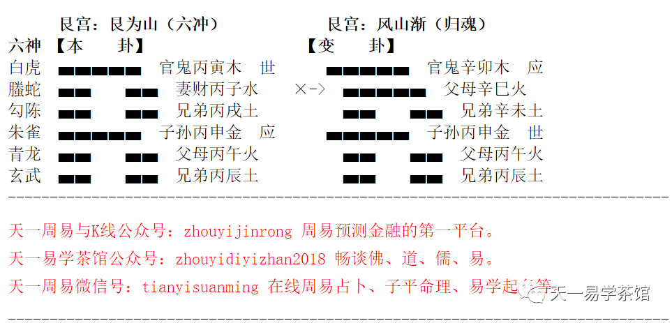 再举一例,未月癸未日,一男问儿子外出两天未归,如何?得艮为山变风山渐卦。