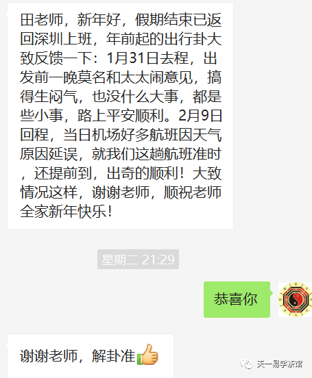 田老师,新年好,假期结束已返回深圳上班,年前起的出行卦大致反馈一下:1月31日去程,出发前一晚莫名和太太闹意见,搞得生闷气,也没什么大事,都是些小事,路上平安顺利。2月9日回程,当日机场好多航班因天气原因延误,就我们这趟航班准时,还提前到,出奇的顺利!大致情况这样,谢谢老师,顺祝老师全家新年快乐!