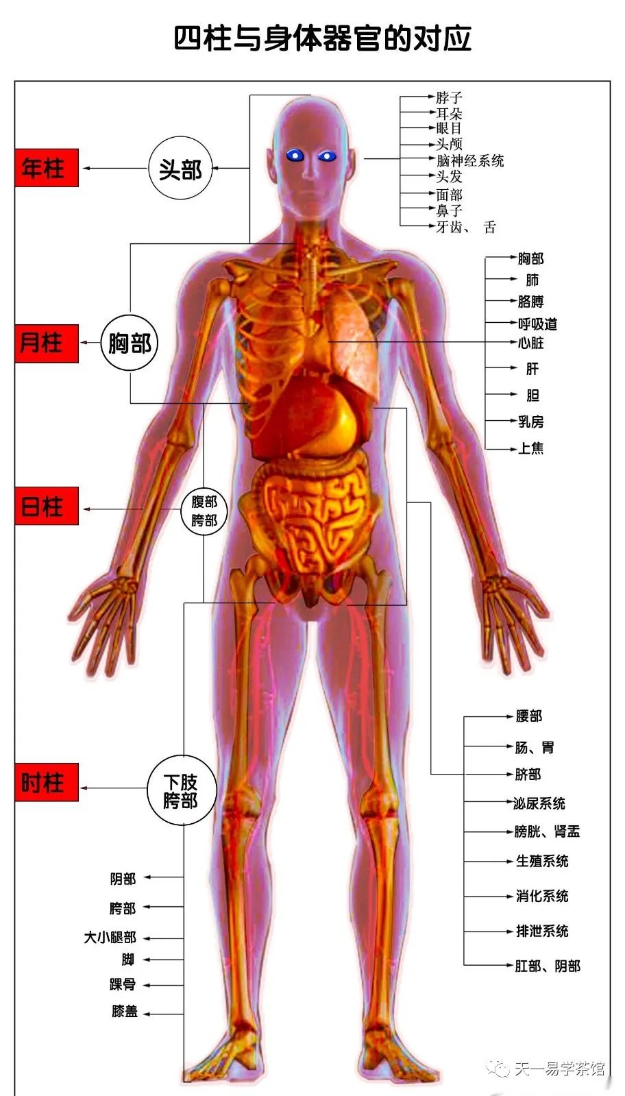 天干五行在四柱中临不同位置所代表的身体器官定位。